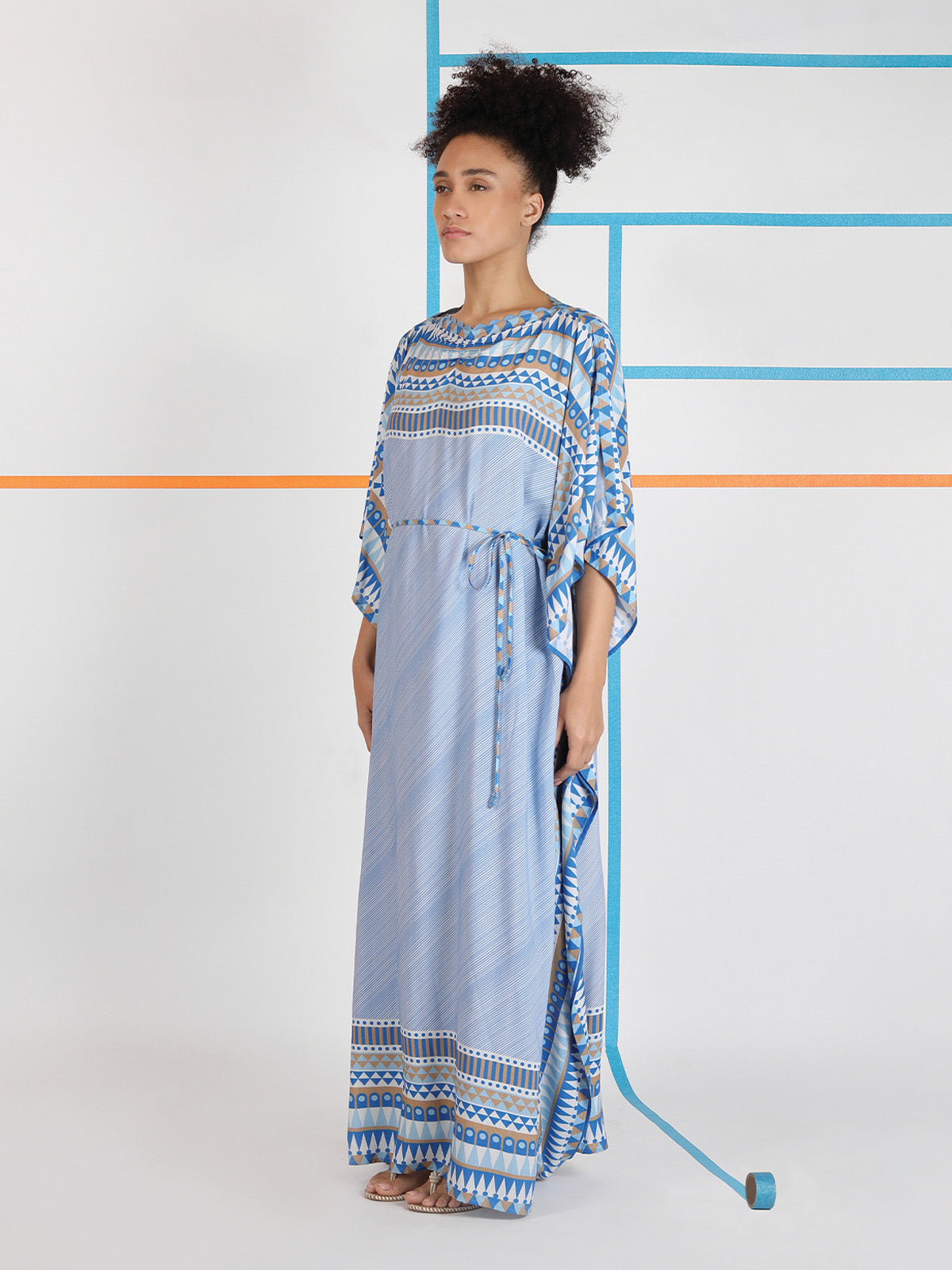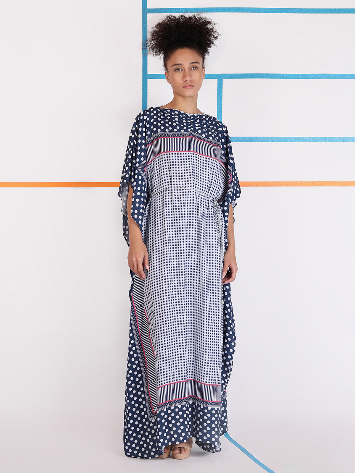 The DIVINA KAFTAN is an effortless statement piece designed for relaxed summer dressing, with a free-flowing silhouette, wide sleeves, and tie-up waist detailing that create an elegant shape flattering every body type. Featuring a mix of Red Gingham Border Print and Polka Dot and Grid Contrast Print, Deep Navy Polka Dots frame geometric panels highlighted by vibrant red stripes, adding a playful modern edge that stands out without overpowering the look. Crafted in 100% viscose, the fabric feels soft, lightweight, and breathable, draping smoothly for all-day comfort, making it perfect for beach days, lounging, or casual outings while delivering a confident, chic summer style.
