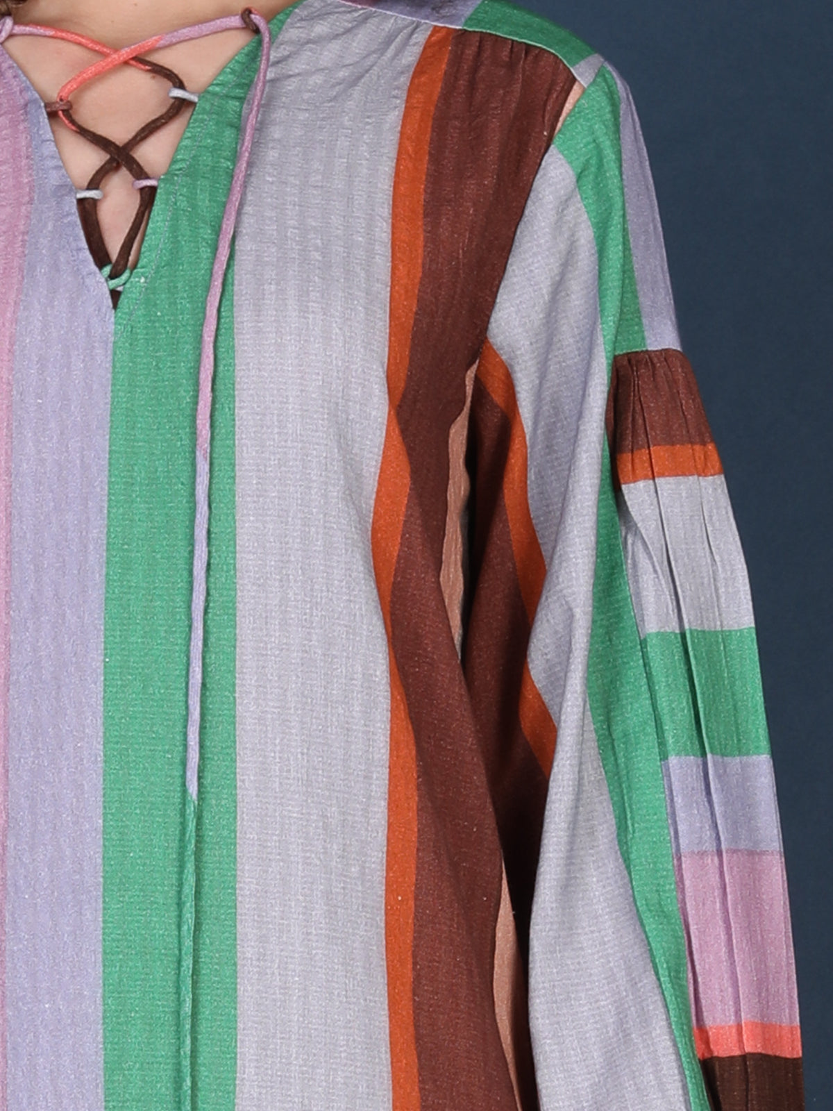 The ELESTERIA DRESS is your wardrobe’s new favorite. Cut from soft striped cotton, it features a flattering V-neckline with a delicate tie, gently puffed long sleeves with elasticated cuffs, and subtle gathers at the back for a graceful silhouette.