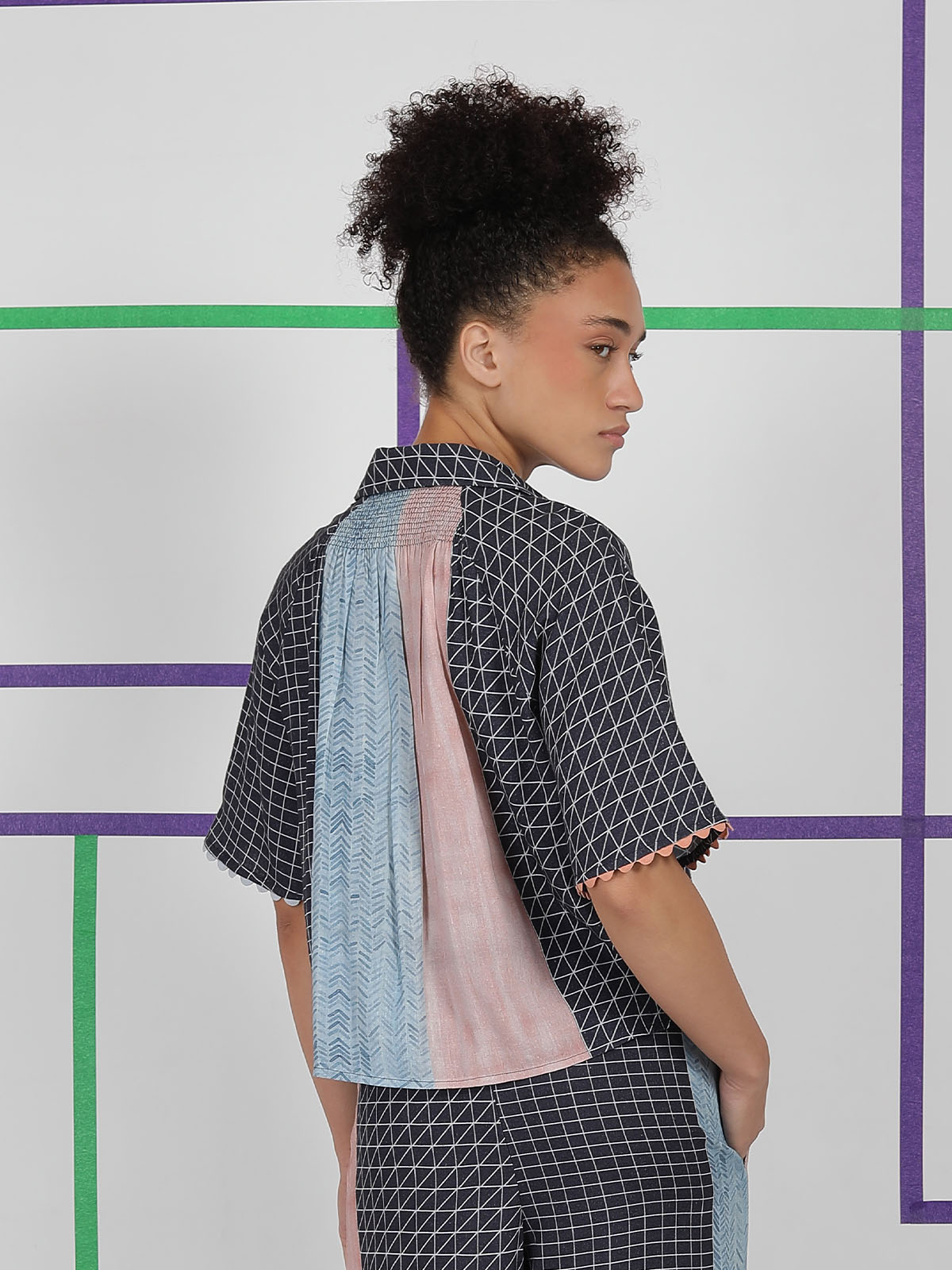 The ERONICA SHIRT features a relaxed boxy fit with short wide sleeves and a soft collar neckline. The mixed panel design blends geometric prints with pastel color blocks, finished with delicate lace trim along the front and sleeve edges. It looks modern and easy when worn, giving a breezy, stylish feel. The fabric is 100% viscose, lightweight, smooth, and comfortable for all-day wear.