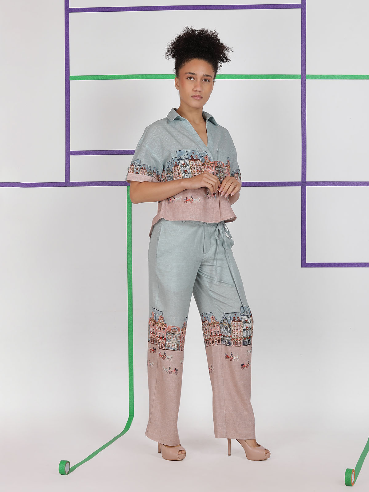 The JENNA TROUSERS come in a relaxed straight fit with a soft waistband and gentle pleats that give a clean, easy fall. The hem carries the same scenic city print as the top, creating a coordinated, standout look. Side pockets add comfort and function. When worn, it feels light, polished, and effortless for daily wear. Fabric is a breathable 70% viscose and 30% linen blend.