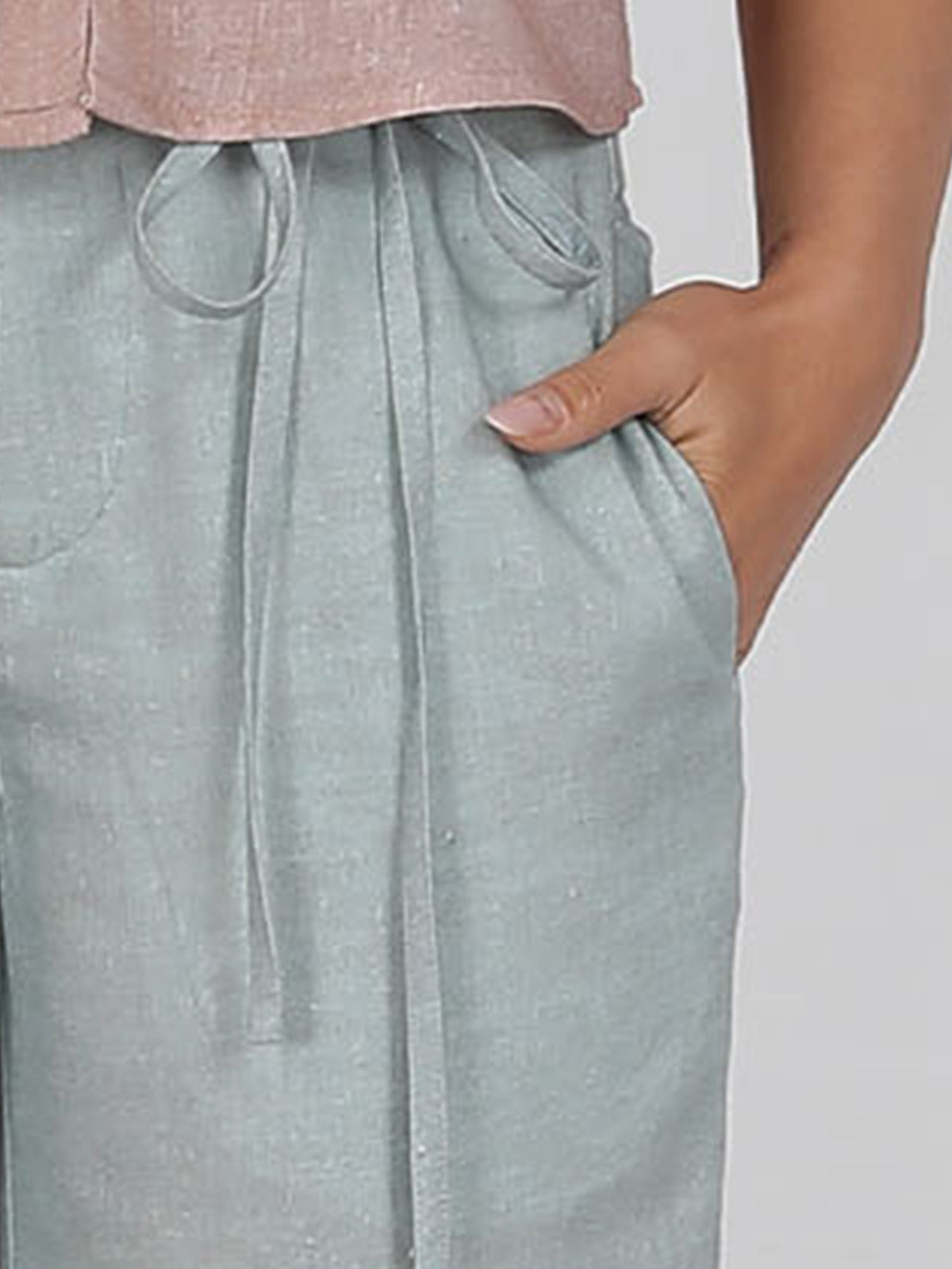 The trousers are cut from 70% Viscose 30% linen fabric.