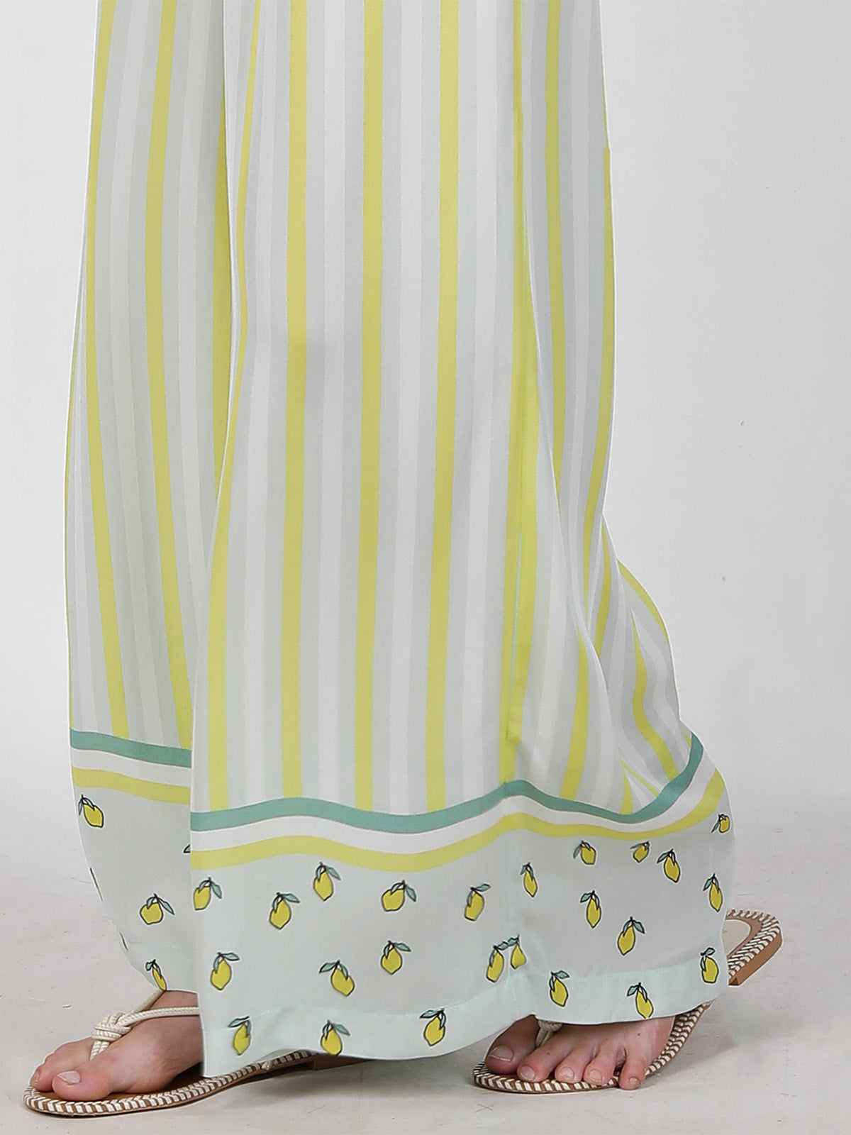 The LIVIA WIDELEG PANTS are designed in a relaxed wide-leg shape that falls smoothly from the waist, giving an easy and comfortable fit. The soft vertical stripe print with lemon border detailing adds a fresh, playful touch. Side pockets are neatly built in for everyday ease. Made in breathable 100% Viscose, the fabric feels light, airy, and soft on the skin, perfect for all-day wear.