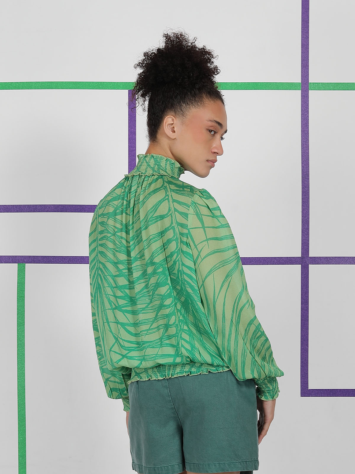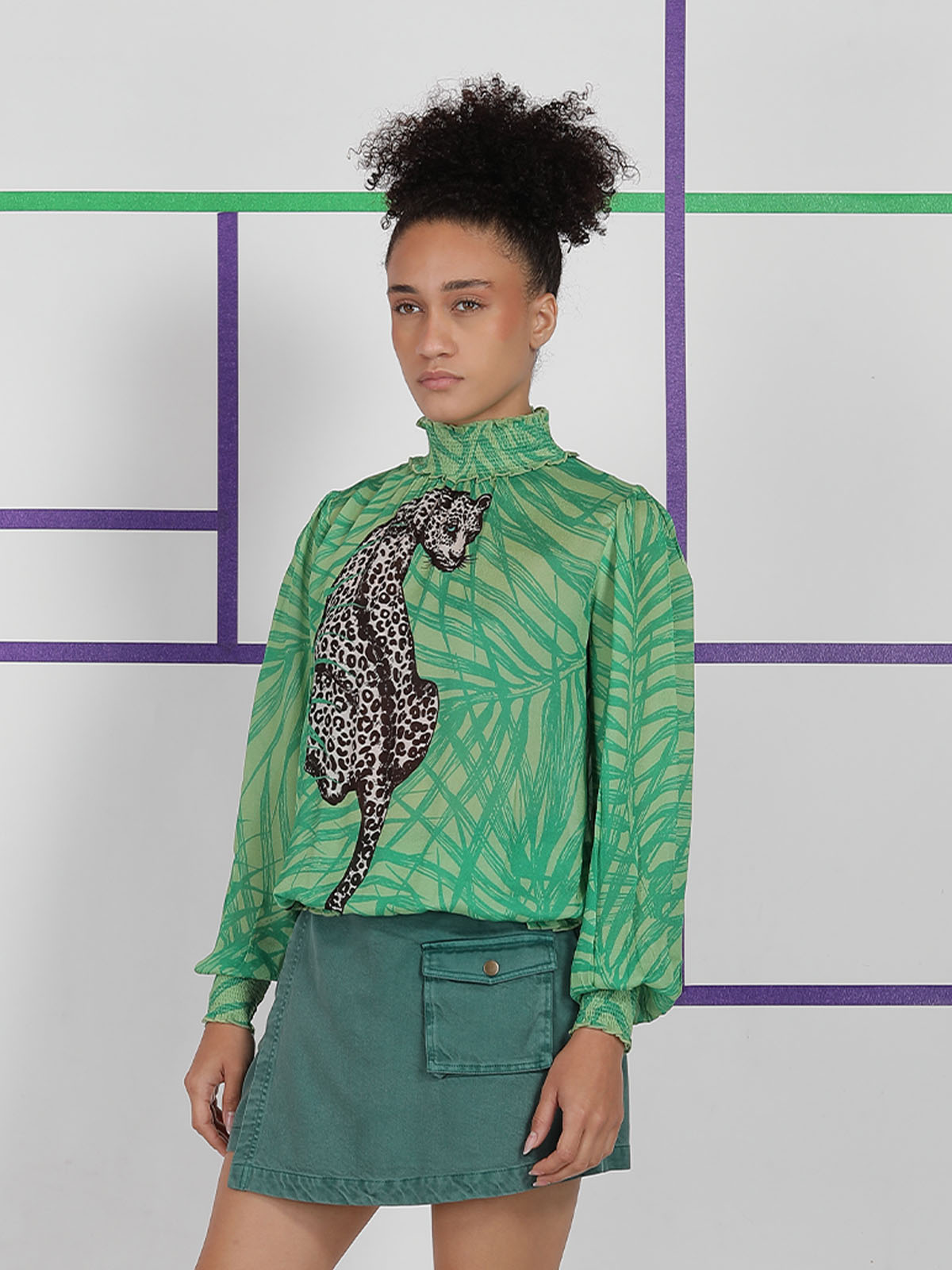 The REBERTTA TOP is made in 100% viscose, so the fabric feels soft, light, and smooth on the body. It features a relaxed, easy fit with a high gathered neckline and soft balloon sleeves. The bold leopard artwork over the green abstract print gives it a statement look. When worn, it drapes fluidly and feels airy, stylish, and comfortable for all-day wear