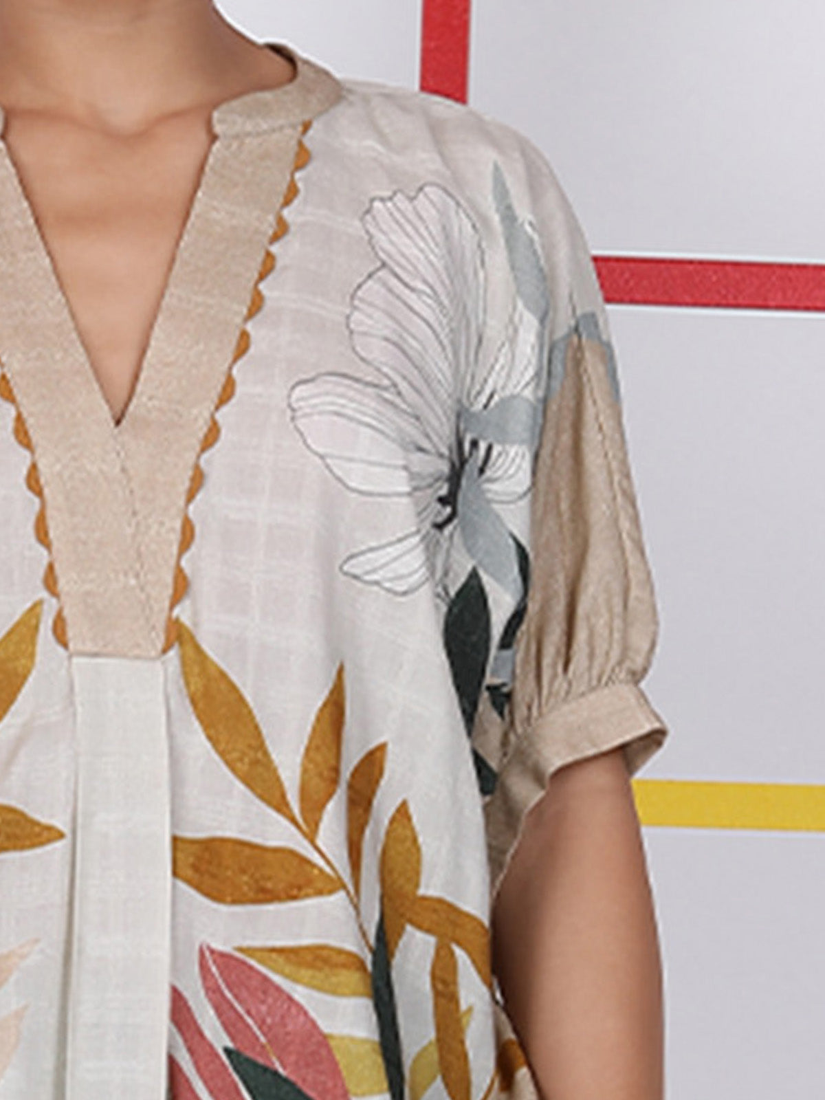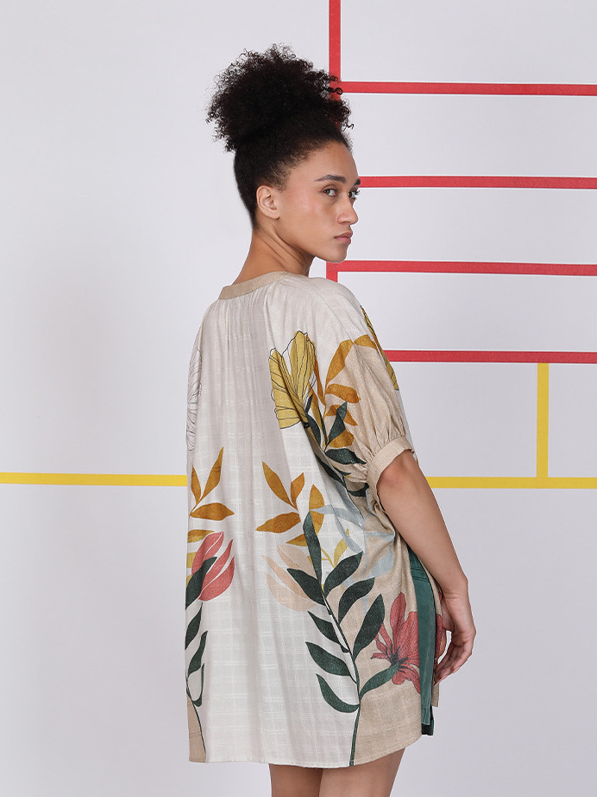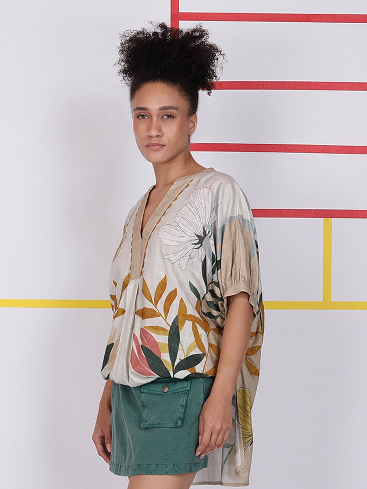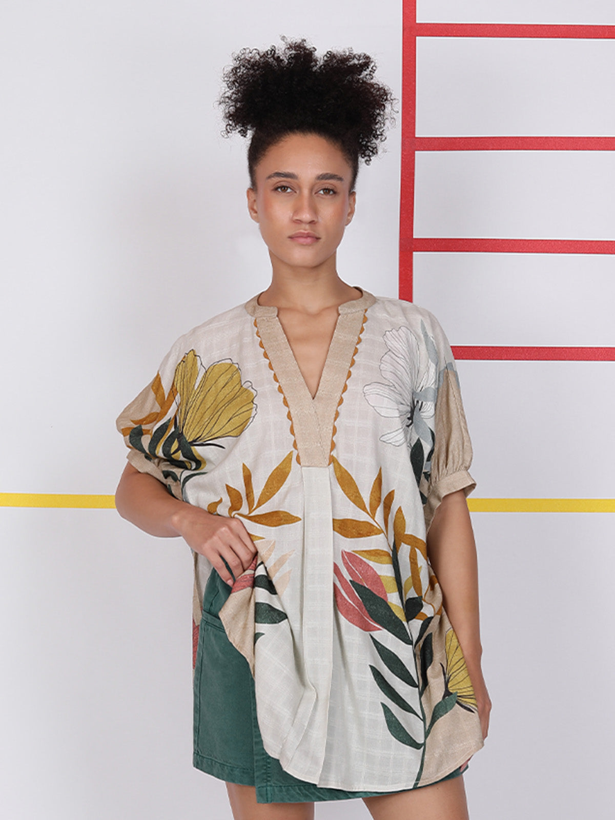 Made from breathable cotton, the one-size CARLIA TUNIC offers comfort and style. Featuring a printed design, lace-trimmed V neckline and front and back gathering for subtle shape—it’s perfect for dressing up or down.