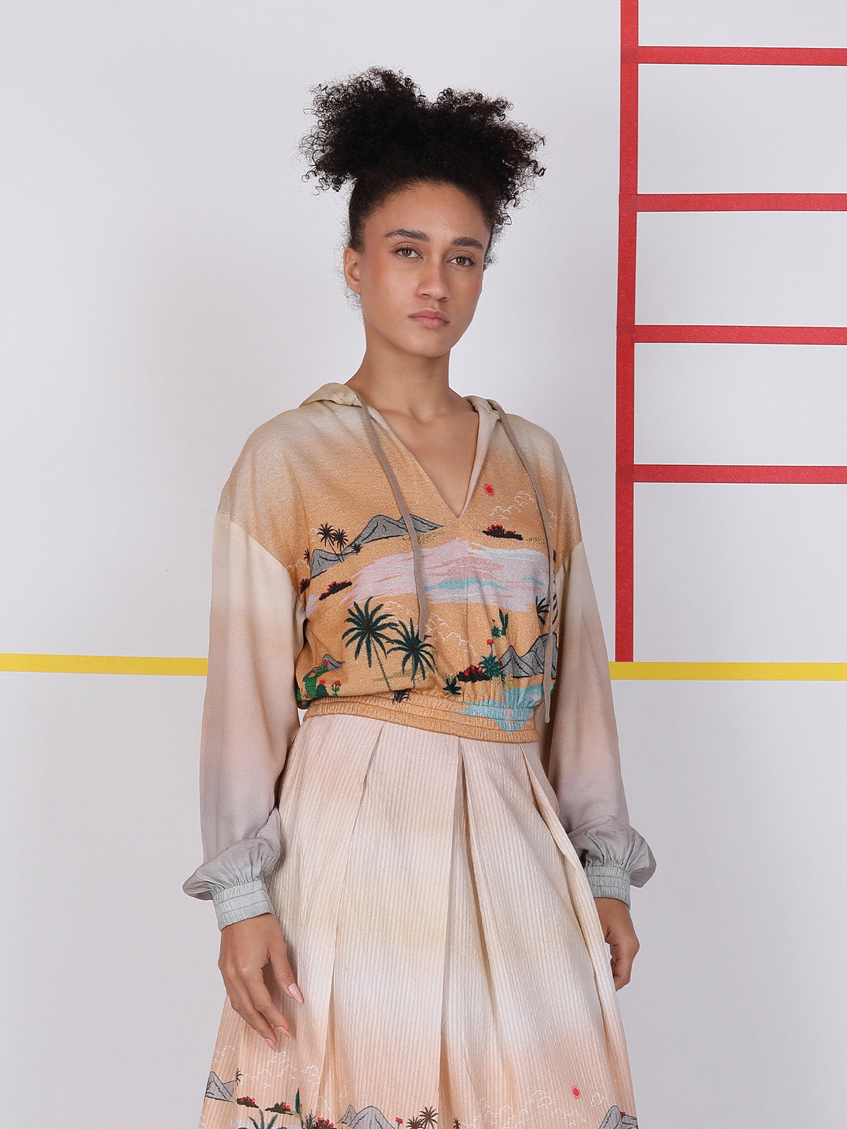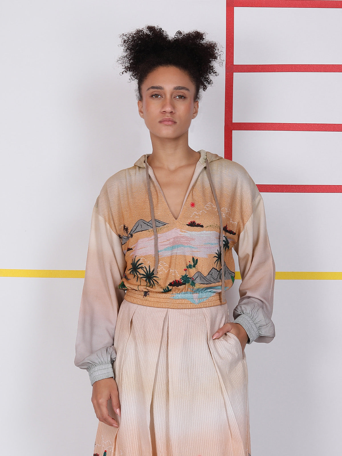 The SAND & BEACH HOODIE features a relaxed fit with a soft hood and elastic waist that shapes the silhouette without feeling tight. The scenic beach print adds a calm, vacation feel, flowing from front to back for a balanced look. It feels easy, light, and comfortable to wear, giving a casual but polished style. Crafted in breathable 100% viscose, it feels light, smooth, and breathable.