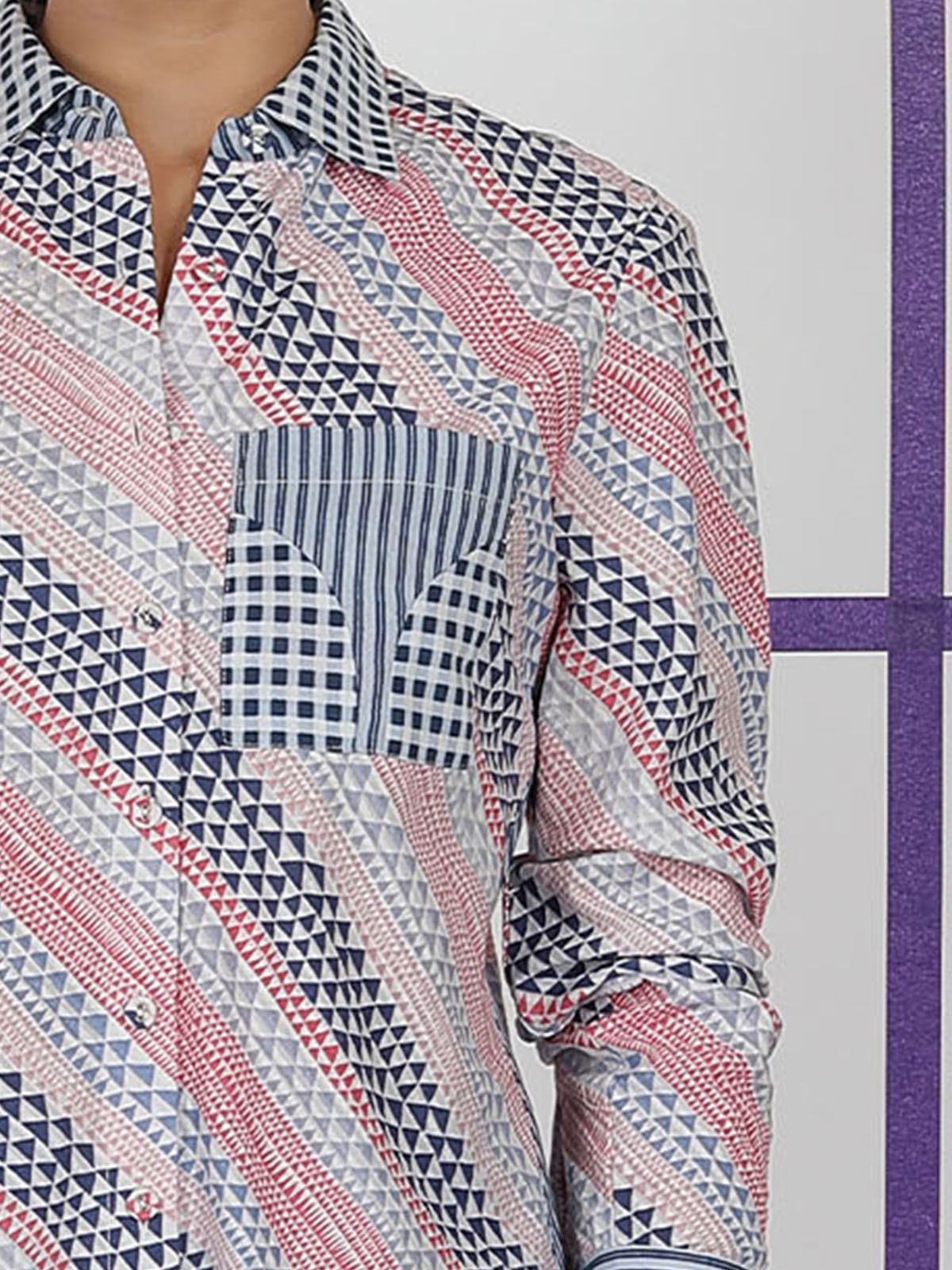The SHANELA SHIRT features a relaxed silhouette with mixed geometric prints and a contrast pocket that adds a playful detail. It sits easy on the body and feels loose and comfortable when worn, giving a clean, casual look. The style is modern, lightweight, and effortless for daily wear. Crafted in 100% cotton, the fabric feels soft, breathable, and easy for all-day comfort.