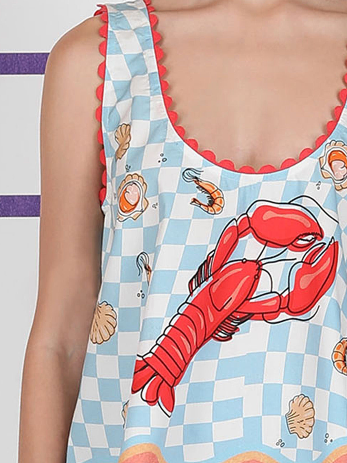 The STIVA TOP features a relaxed sleeveless shape with a soft scoop neckline and contrast scallop trim. The playful seafood print over a light check base adds a fun, fresh look. It sits easy on the body and feels light when worn, perfect for warm days. Crafted in 100% viscose, the fabric feels soft, airy, and comfortable for all-day wear.