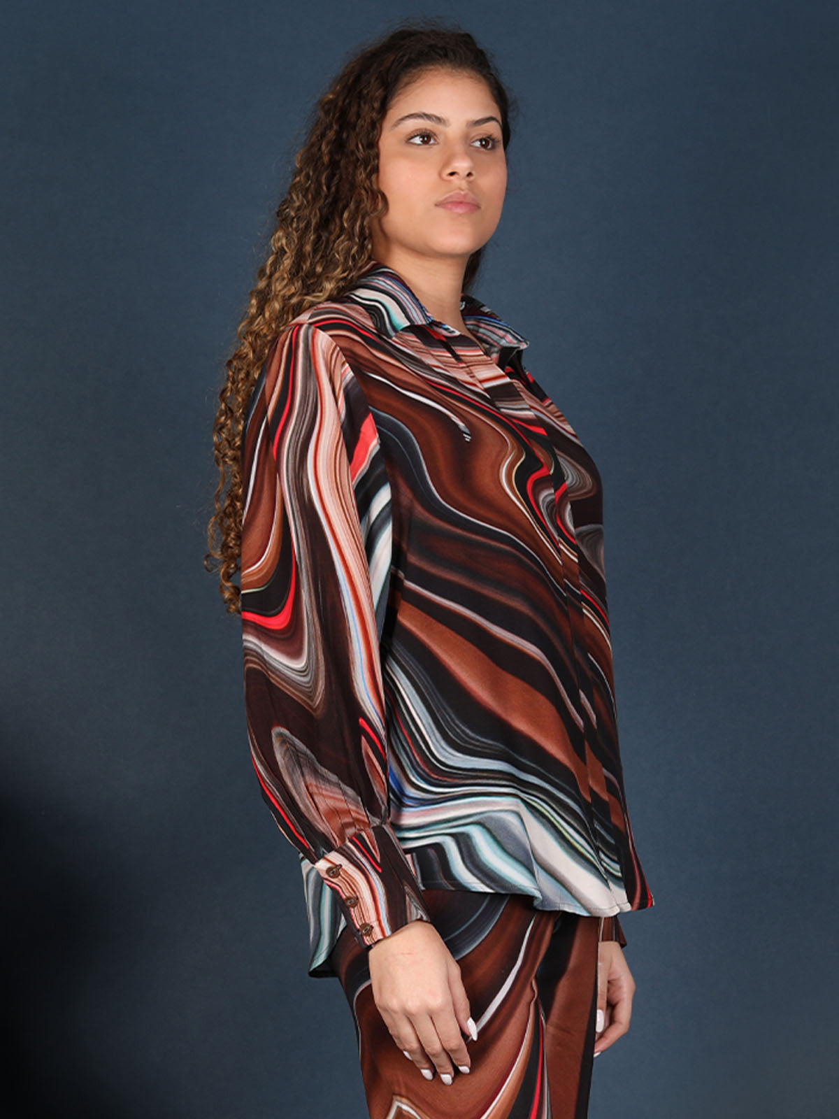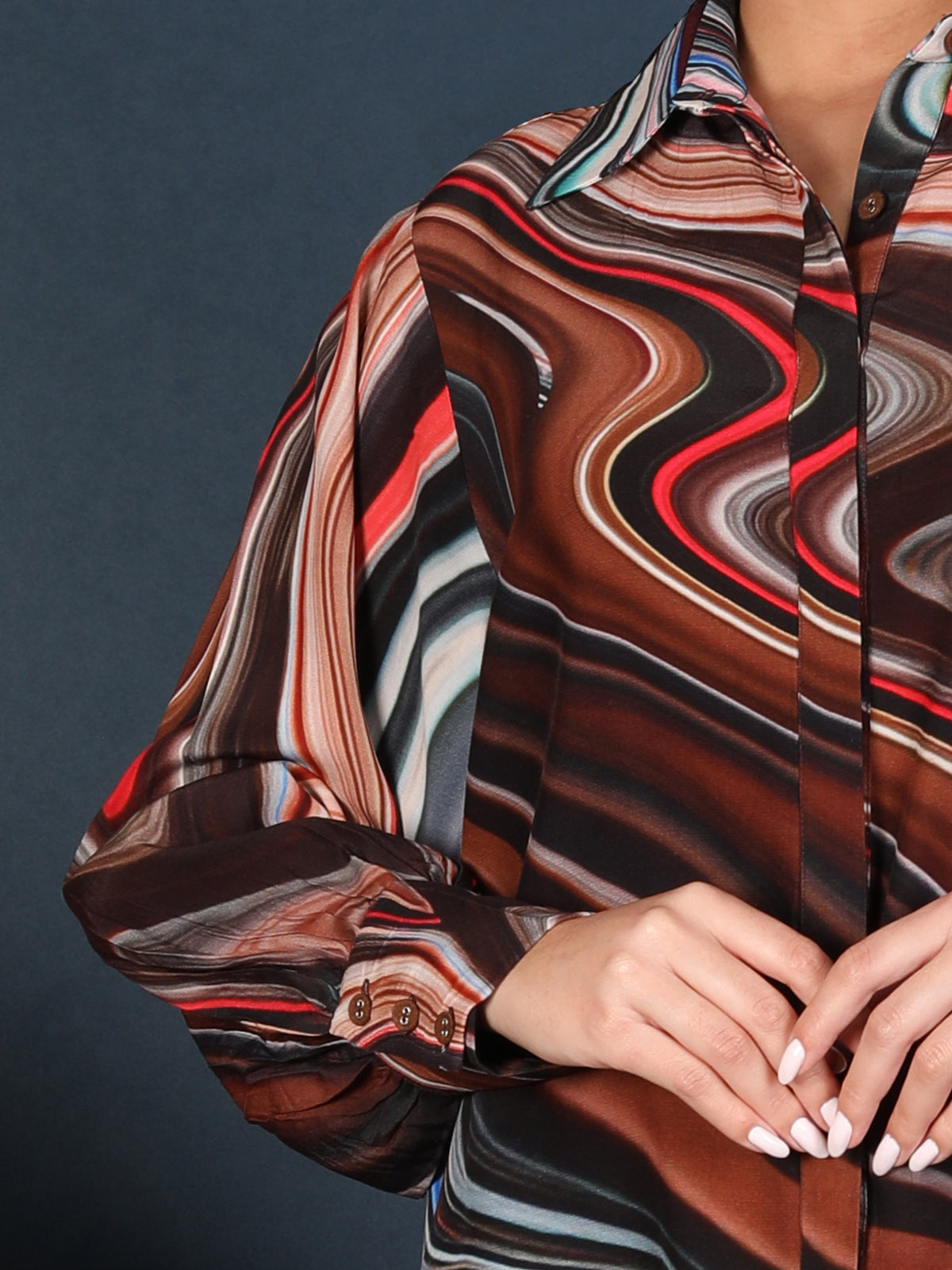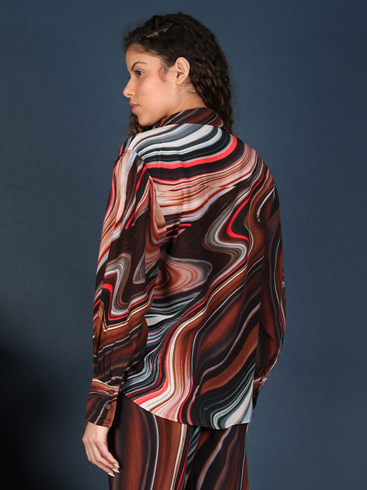 Swirling marble prints meet classic tailoring in the VELISSE SHIRT. Made from breathable viscose, it features a collar neck, button-down front, and long sleeves with buttoned cuffs. Lightweight and fluid, it's a refined piece that pairs beautifully with the VENYA WIDELEG PANTS for a chic, put-together outfit.